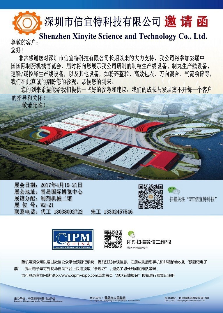 非常感謝您對深圳市信宜特科技有限公司長期以來的大力支持,我公司將參加53屆中 國國際制藥機械博覽會,屆時將向您展示我公司研制的制粒生產線設備、制丸生產線設備、 速釋/緩控釋生產線設備,以及其他設備,如粉碎整粒、高效包衣、萬向混合、氣流粉碎等, 我們在此真誠的期盼您的參觀,恭候您的到來。 您的到來希望能給我們提供些好的參 考和建議,我們的成長與發展離不開每一個客戶 的指導和關懷!
