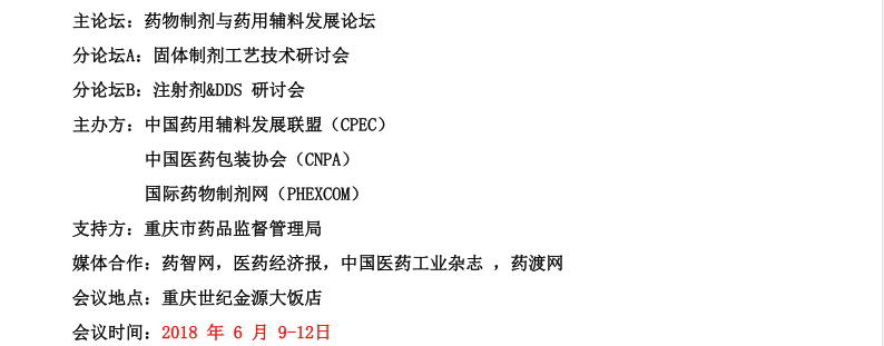 國家不斷深化藥品審評審批改革,推進藥品全生命周期管理,全面落實藥品質 量安全責任,針對性地進行生產工藝核查,我國醫藥產業面臨供給側結構改革的任 務。藥品審評審批制度改革方向是簡化審評審批程序,鼓勵創新,突出藥品上市許 可持有人(MAH) 主體地位。通過簡化審評、鼓勵創新、MAH 制度和藥品全生命周期 管理等監管思路和理念統籌思考藥用輔料藥包材與藥品關聯審評審批制度。選擇和 使用藥用輔料、藥包材應由藥品上市許可持有人(制劑企業)基于制劑特點來判斷, 進而系統評價藥品的安全有效穩定。總局將加快藥包材藥用輔料登記平臺建設,進 -步完善和細化相關政策。為更好的推進藥品全生命周期的管理,促進中國藥物制 劑的快速發展,《第六屆PhExFEST 中國藥物制劑節&暨2018中 國制藥科學家大會》 將于6月上旬在重慶舉行。屆時將邀請總局有關部門、中檢院、藥典委員會、科研院 校、制劑研發CRO、藥輔和設備儀器企業的專家作主題報告。熱誠歡迎藥物制劑生產、制劑研發、制藥設備、分析儀器、藥用輔料及包材等企業代表和科研高校師生參 加本屆大會。