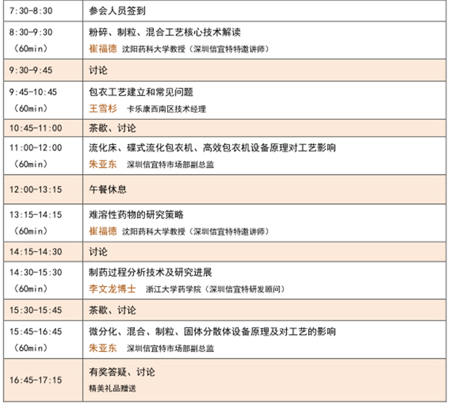 為加強(qiáng)制劑人員對(duì)固體制劑工藝及設(shè)備原理的理解,特邀請(qǐng)崔福德教授做專(zhuān)場(chǎng)講座,主要介紹固體制劑的制備工藝原理以及難溶性藥物的研究策略,信宜特研發(fā)顧問(wèn)浙大藥學(xué)院李文龍博士,將結(jié)合信宜特正在開(kāi)發(fā)的光譜成像技術(shù)對(duì)連續(xù)化生產(chǎn)的意義及制藥過(guò)程分析技術(shù)做深入解讀,同時(shí)我們還邀請(qǐng)了卡樂(lè)康區(qū)域技術(shù)服務(wù)經(jīng)理王雪杉,卡樂(lè)康作為包衣輔料及技術(shù)服務(wù)的典范,將著重介紹包衣工藝建立和常見(jiàn)問(wèn)題分析,信宜特技術(shù)人員將著重介紹制劑設(shè)備原理對(duì)工藝的影響,歡迎制劑相關(guān)人員踴躍報(bào)名。